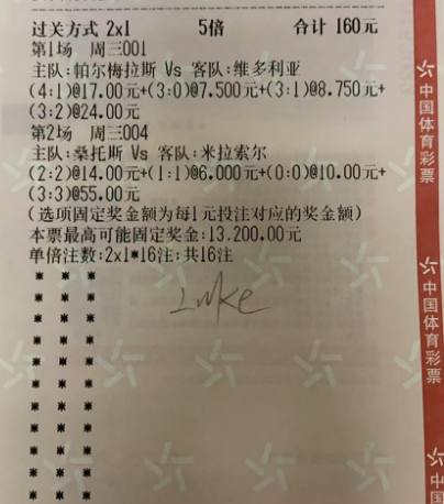 《2串1》001帕梅拉斯+004桑托斯(比分,进球数,半全场)