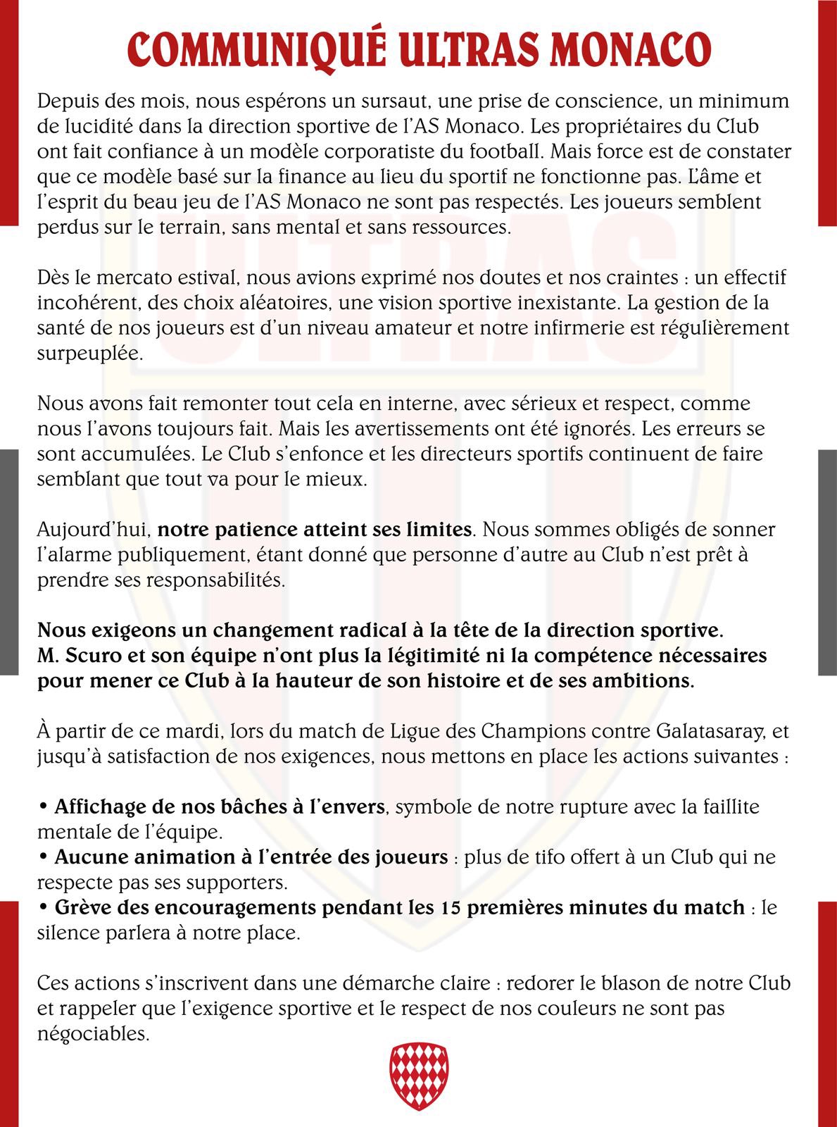 摩纳哥上轮欧冠打平了实力相对孱弱的帕福斯,同时上轮联赛是客场0-1输给了布雷斯特,虽然他们缺少了扎卡里亚以及巴拉贡一些主力球员,但是当布雷斯特在60分钟也被罚下一人,他们在长达半小时的时间内进攻端并没有制造更多的机会,甚至没有1次射正,最终输掉了比赛。那么这场比赛输球之后,该俱乐部的球迷组织已经在网上发表了声明,呼吁俱乐部“立即做出改变”,希望包括现任体育管理层,特别是首席执行官蒂亚戈·斯库罗离职,同时在本场比赛中,他们将会实施行动像俱乐部施压,分别是倒挂横幅、球员入场时没有欢呼声以及在比赛开始的15分钟内不会给球队加油等等。