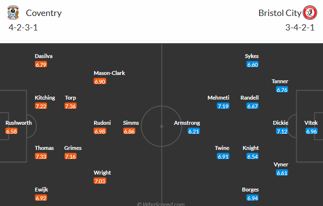 考文垂上轮做客1比1打平普雷斯顿,他们在多打一人的情况下没能守住优势,被第二的米德尔斯堡把两队之间的分差缩小到5分。多文、埃克尔斯和阿桑特因伤缺阵。布里斯托尔城上轮在主场2比2打平莱斯特城,麦克诺利、阿特金森和乔-威廉斯因伤缺阵,斯托克斯和伯德伤愈复出。结合指数的态度,本场我力挺主胜。