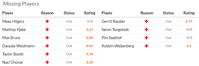 前进之鹰上赛季一路爆冷拿到荷兰杯的冠军,拿到锦标肯定是好事,但球队不得不参加本赛季的欧联杯,这导致球队在多线作战的情况下难以应对。近8场比赛,前进之鹰1胜2平5负,其中周中欧联杯做客1比2输给法甲劲旅里昂。人员方面,打进2球的德国中卫瑙贝尔等4人无法出战。
