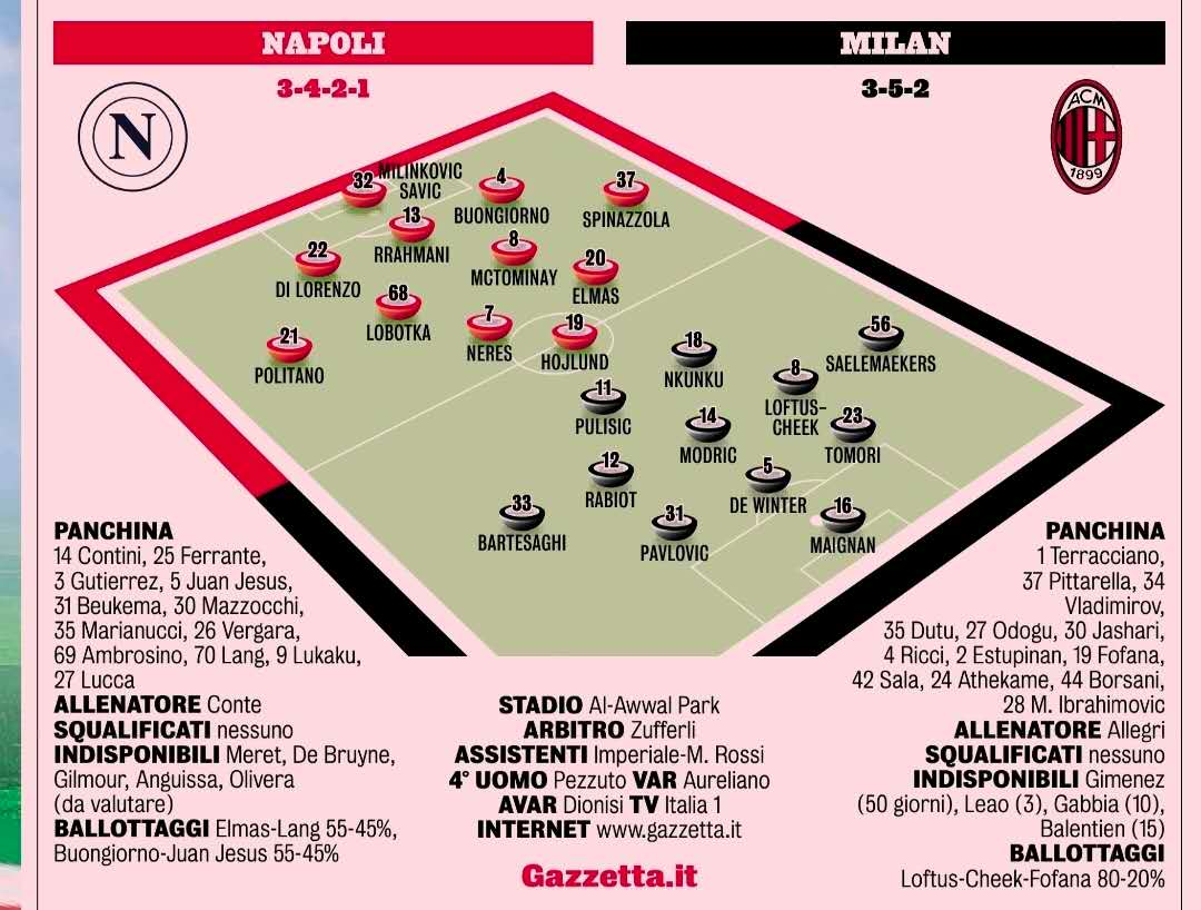 那不勒斯(3421) Milinkovic-Savic; Beukema, Rrahmani, Buongiorno; Di Lorenzo, Lobotka, McTominay, Gutierrez; Lang, Neres; Hojlund