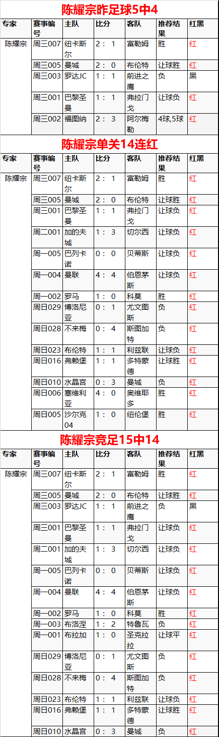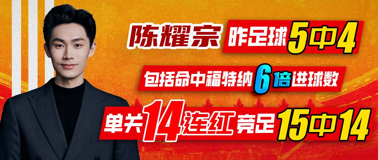 陈耀宗昨足球5中4 包括命中福图纳6倍进球数 单关14连红 竞足15中14