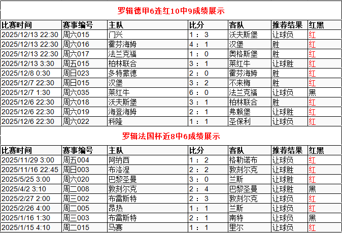 德甲6连红10中9 法国杯近8中6 点击→