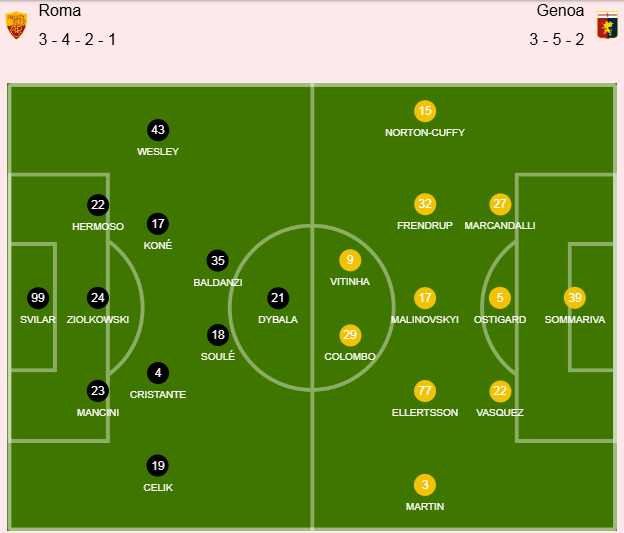 罗马上轮做客1比2不敌尤文图斯,随着本轮尤文先赛获胜,罗马暂时跌到了积分榜的第5位,如果想要回到积分榜前四,本场必须拿到3分。人员方面,中场埃洛伊和后卫恩迪卡都被非洲杯抽调,博维和多夫比克继续因伤缺阵。迪巴拉、苏莱和巴尔丹齐领衔前场。热那亚的喀麦隆后腰简-奥纳纳出征非洲杯,另有弗伦德鲁普、格伦巴克、厄斯蒂高等北欧球员因伤缺阵。罗马过去3次主场对阵热那亚都取得了胜利,我看正路!