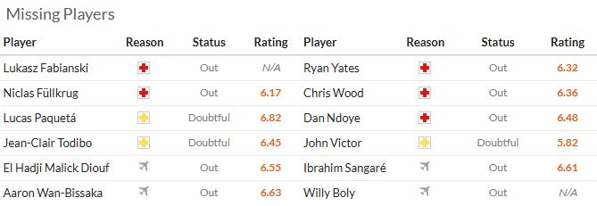 两队上轮都遭遇失利,处境非常艰难,两队的主教练努诺-桑托和肖恩-戴奇都是中途上任,现在也有可能被其他后来人替代。双方各有两人参加非洲杯,西汉姆联是万比萨卡和哈吉-迪乌夫,诺丁汉森林是维利-博利和伊布拉西姆-圣加雷。两队的高中锋菲尔克鲁格和克里斯-伍德都因伤缺阵。结合指数的态度,我看好平。
