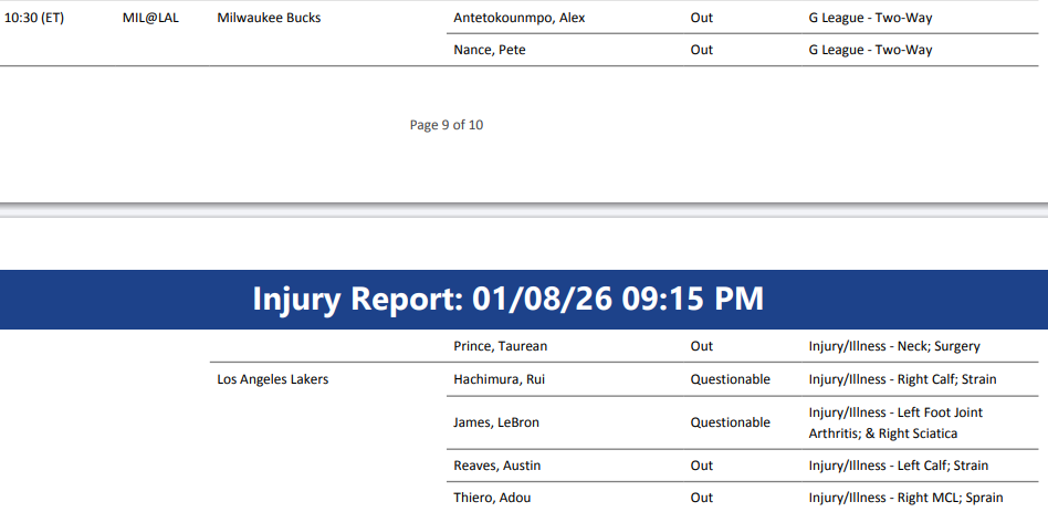 我们首先看两支球队的人员情况,雄鹿队除了普林斯无法登场,其他球员全部健康,湖人队这边詹姆斯和八村塁都出战成疑,里夫斯和迪耶罗都是不打。