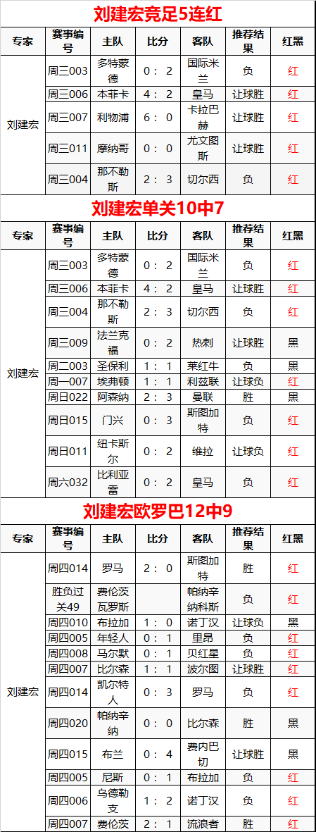 刘建宏竞足5连红 单关10中7 欧罗巴12中9