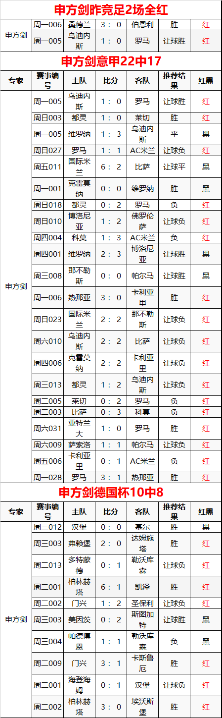 申方剑昨竞足2场全红 意甲22中17 德国杯10中7