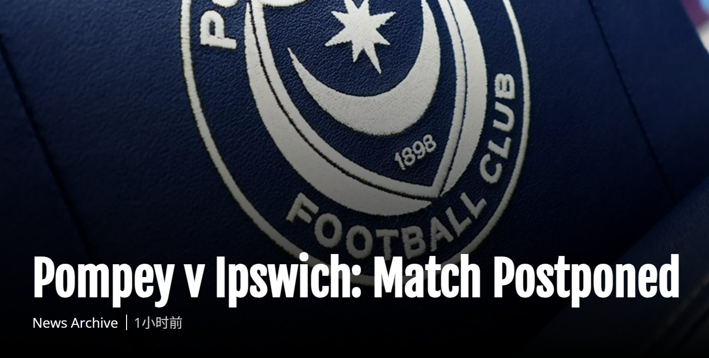 朴茨茅斯原定今晚在弗拉顿公园球场与伊普斯维奇进行的英冠联赛,因场地积水宣布推迟。此前当地连夜持续降雨,且降雨天气一直延续至次日上午,天气预报显示雨势将持续至比赛开球前后,而球场草皮本就已处于饱和状态,最终导致赛事无法如期进行。
