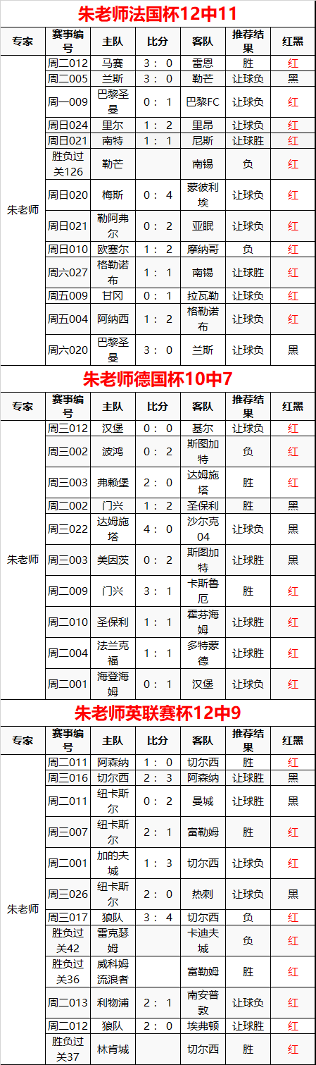朱老师法国杯12中11 德国杯10中7 英联赛12中9