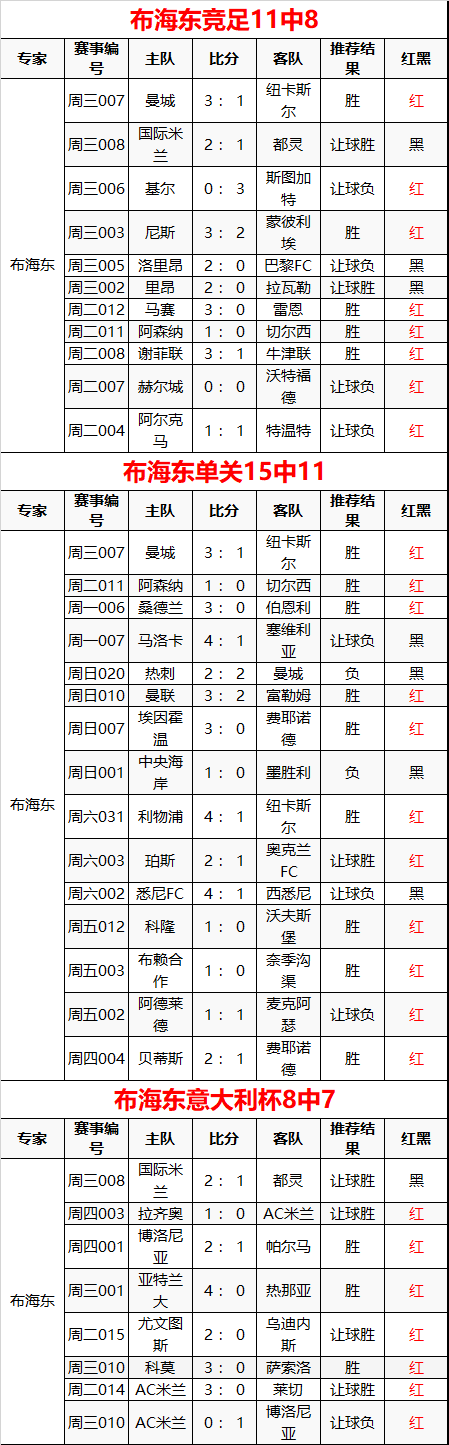 布海东竞足11中8 单关15中11 意大利杯8中7