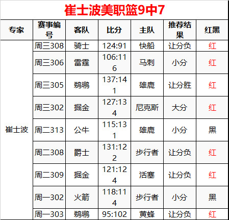 昨美职篮4场全红 长线9中7