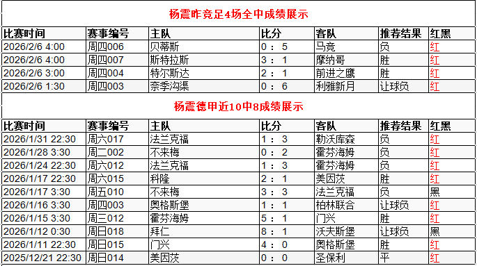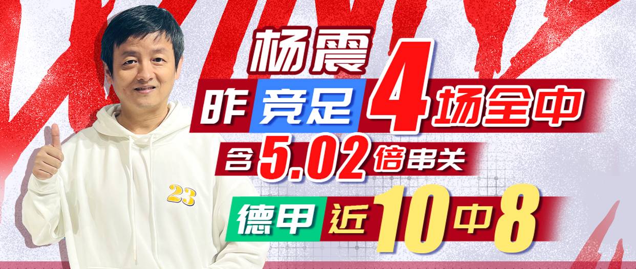 杨震昨竞足4场全中 含5.02倍串关 德甲近10中8
