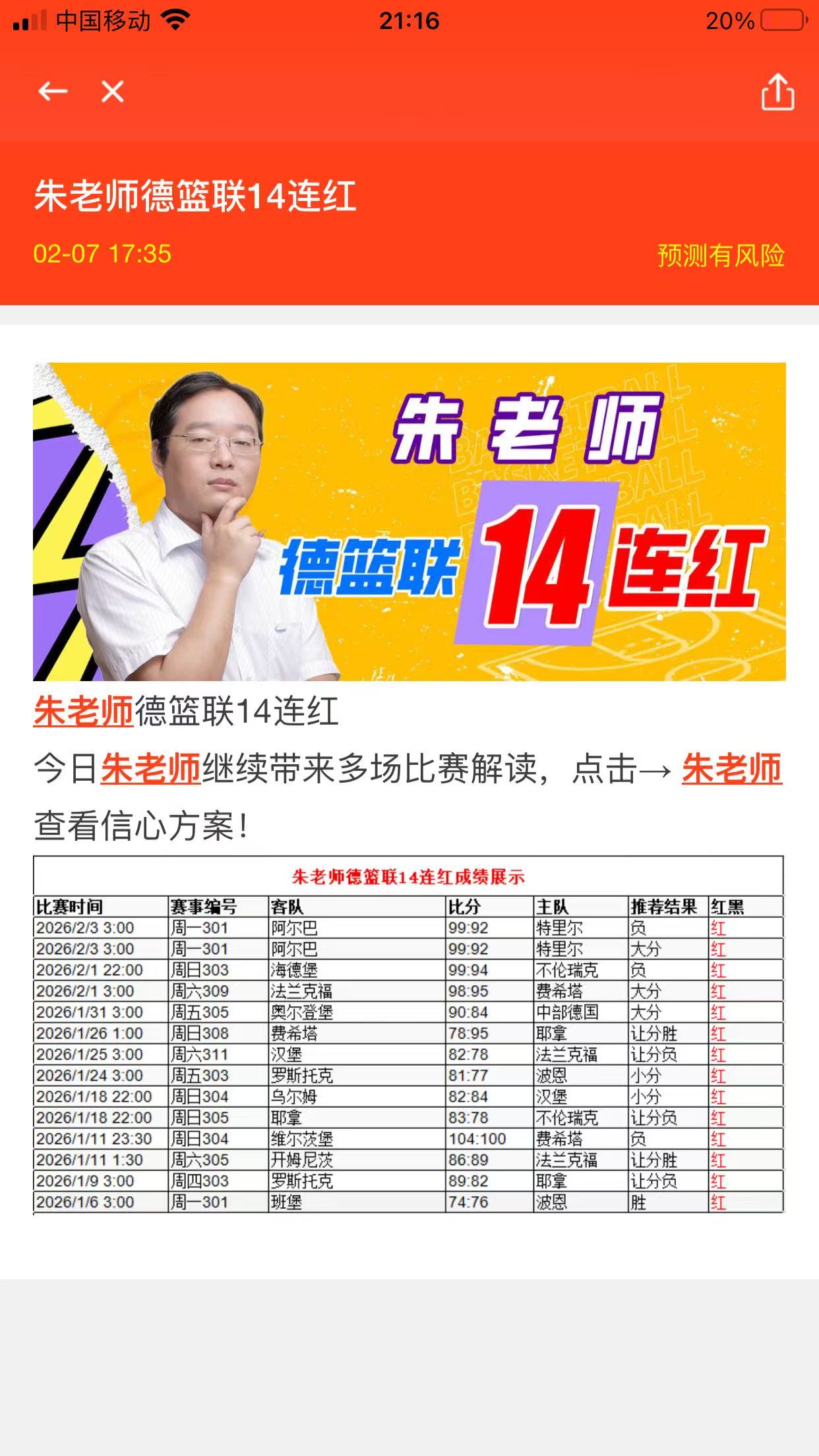 《朱老师解锁》下午澳系4战3中,状态好,销售旺!晚上的竞足等系列产品,销售很棒,基本完成日均销售目标,提示大家多关注我的德篮联!周中2胜,目前去年12月才进入中国竞彩的《朱 老师德篮联》14连胜、开办以来23中20,匹马领先!目前小猫编辑部重点推荐产品!