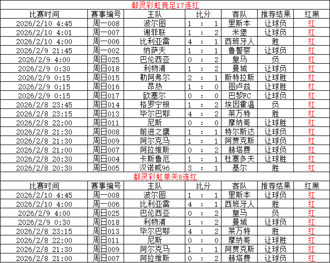 都灵彩虹昨竞足4场全红 长线17连红 单关8连红