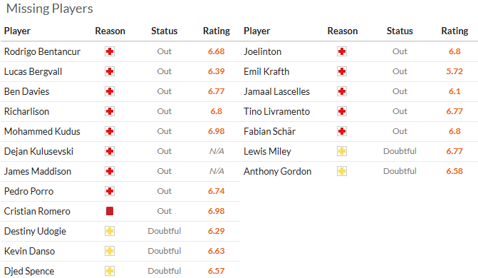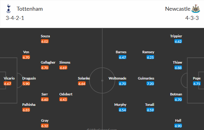 热刺上轮联赛做客0比2不敌曼联,阿根廷中后卫克里斯蒂安-罗梅罗毫无必要的恶意犯规导致他被红牌罚下,球队最终0比2落败。本场罗梅罗停赛,库卢塞夫斯基、麦迪逊、波罗、库杜斯、理查利松、本坦库尔和贝里瓦尔都因伤缺阵,乌多基、丹索、斯彭塞出战成疑。纽卡斯尔联近期的状态也不好,近8场只有1胜,其余7场2平5负,其中上轮联赛在主场2比3不敌布伦特福德。舍尔因伤缺阵、丹-伯恩等人因伤缺阵。搏客胜!