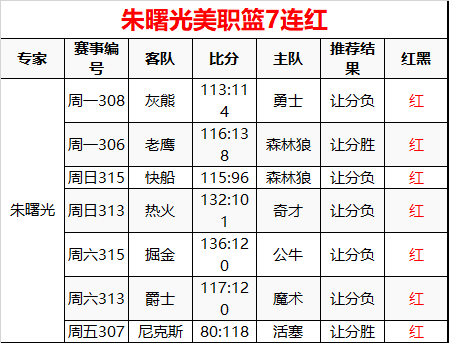 朱曙光昨日美职篮2场全红 实时7连红