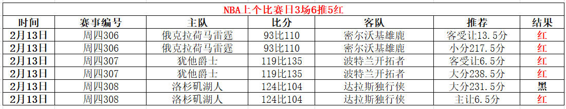 NBA上个比赛日,雷霆主场93比110不敌密尔沃基雄鹿,我分析雄鹿受让13.5分以及小分217.5分胜同时命中,成功一鱼双吃;爵士主场119比135不敌开拓者,我分析开拓者受让6.5分胜以及大分238.5分胜同时命中,成功一鱼双吃。湖人主场124比104击败独行侠,我分析湖人让6.5分胜命中,大分231.5分错误。NBA3场6推5红!超级比赛日超级红!明天10场NBA的大小分+让分分析已经全部发出。