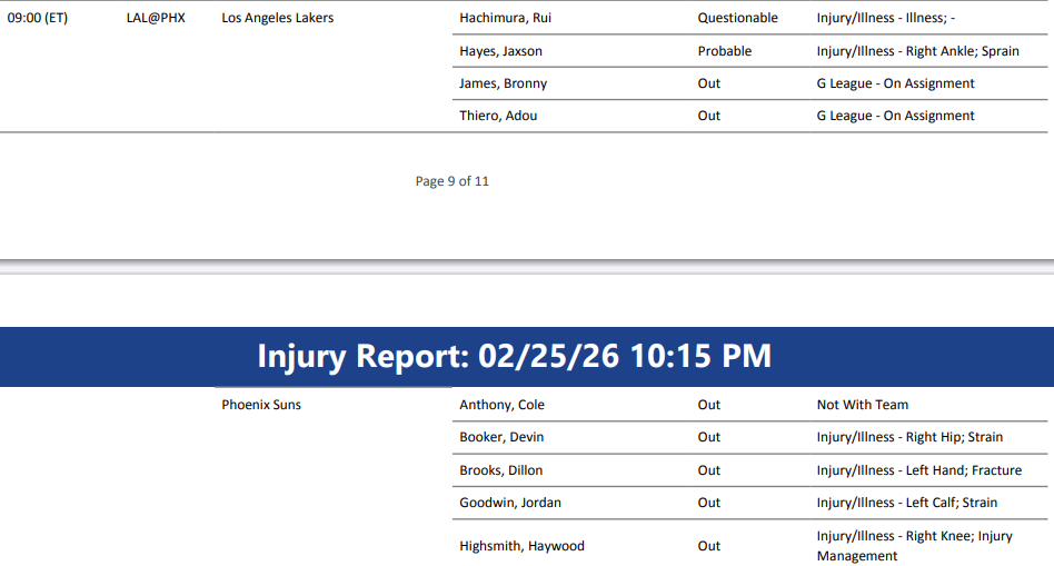 目前湖人与太阳分列西部第六和第七,仅有两个胜场差,这场比赛的结局等同一场顶两场。但是决定比赛走势的最大变量在于伤病。太阳队遭受了毁灭性打击,根据最新伤病报告,德文·布克、狄龙·布鲁克斯(左手骨折)、乔丹·古德温、海伍德·海史密斯以及科尔·安东尼共五名核心轮换将缺席比赛。这意味着太阳不仅失去了头号得分手,其外线轮换深度也几乎被抽空。反观湖人,虽然八村塁因生病出战成疑,但内线支柱海斯大概率复出,这对于湖人攻防两端的战术价值巨大。