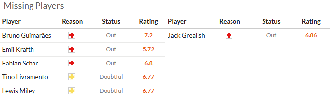 纽卡斯尔上轮联赛做客1比2不敌曼城,欧冠次回合主场3比2击败阿塞拜疆球队卡拉巴赫,最终总比分9比3淘汰对手晋级16强,也让英超球队创造了几乎不可能的6支球队全部进入欧冠16强的纪录。吉马良斯、克拉夫特、舍尔等人继续因伤缺阵,米利和利夫拉门托出战成疑。埃弗顿缺少格拉利什。纽卡一周双赛不热,干!
