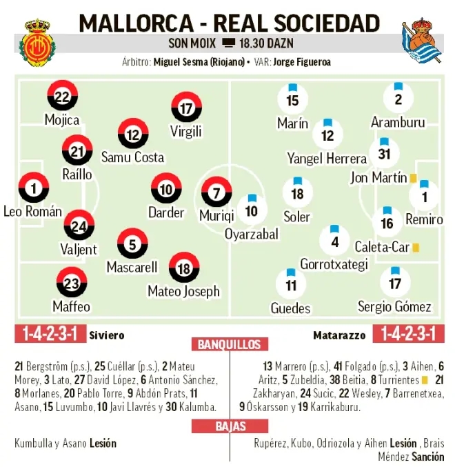 马洛卡上轮做客0比2不敌塞尔塔,近期遭遇3连败,再次跌入降级区,落后身前的埃尔切1分,落后巴伦西亚和巴列卡诺2分。人员方面,后卫昆贝拉和日本前锋浅野拓磨继续因伤缺阵。做客的皇家社会战绩回到积分榜的中游,看起来无欲亦无求,保级压力不大。久保建英等人因伤缺阵,布莱斯-门德斯停赛。让胜!