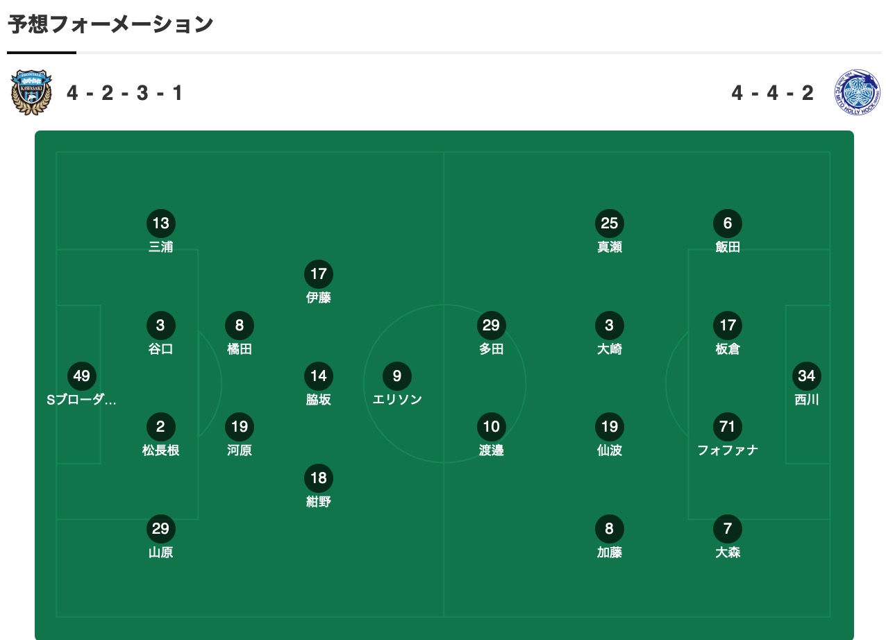 川崎前锋上赛季J联赛排名第8位,赛季打入67球是联赛中最强的火力,不过防线也丢了57球,这和長谷部茂利以往注重防守的执教风格非常不符,新赛季在门将位置上引进了布罗德森,他到来后也是占据了主力的位置,防线上加盟的谷口栄斗、山原怜音同样也是成为主力,后者还在上轮1-2输给FC东京的比赛中打入一球,从福岛联租借回归的小将松長根悠仁也是成为主力,新赛季的防线变化还是较大,中前场的人员则是保持了稳定,只有从福冈黄蜂引进了紺野和也一人,他也是新赛季的主力候选。目前进行的3轮联赛在常规时间取得1胜1平1负的成绩,进攻端打入6球但防守端还是丢了5球,本场后卫丸山祐市、中场長璃喜都因伤缺席,后卫佐々木旭、中场大島僚太出战有一定疑问。
