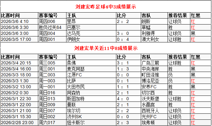 刘建宏昨足球4中3 单关近11中8