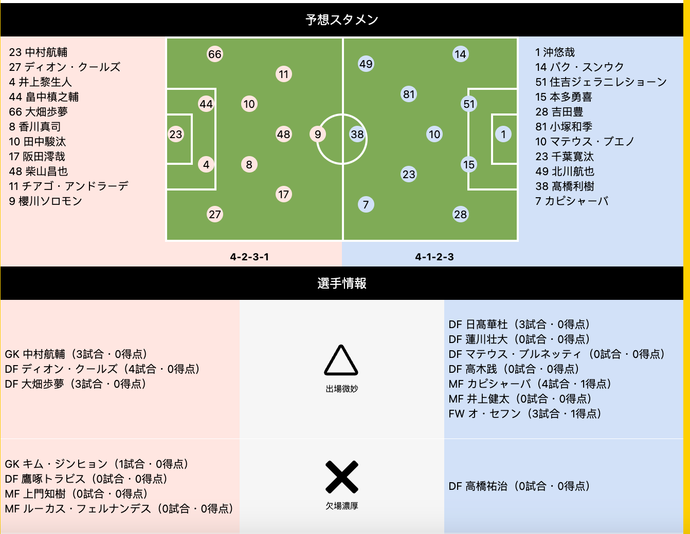 清水鼓动实力毕竟是相对一般,但是从成绩的角度出发,反而是相对不错。上场比赛是打平了大阪钢巴,点球的比赛他们是击败了对手,状态没有太多的疑问。但是从阵容上来看,上场比赛结束之后,球队有了新增的伤停,后卫日髙華杜以及前锋吴世勋都是大概率缺席。