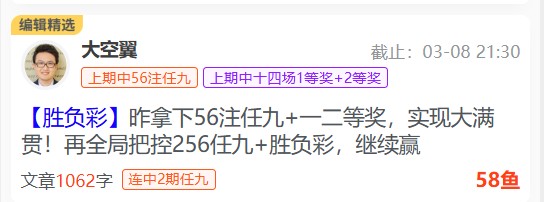 总计2026年命中5期任九+5次胜负彩二等奖+4次胜负彩一等奖。