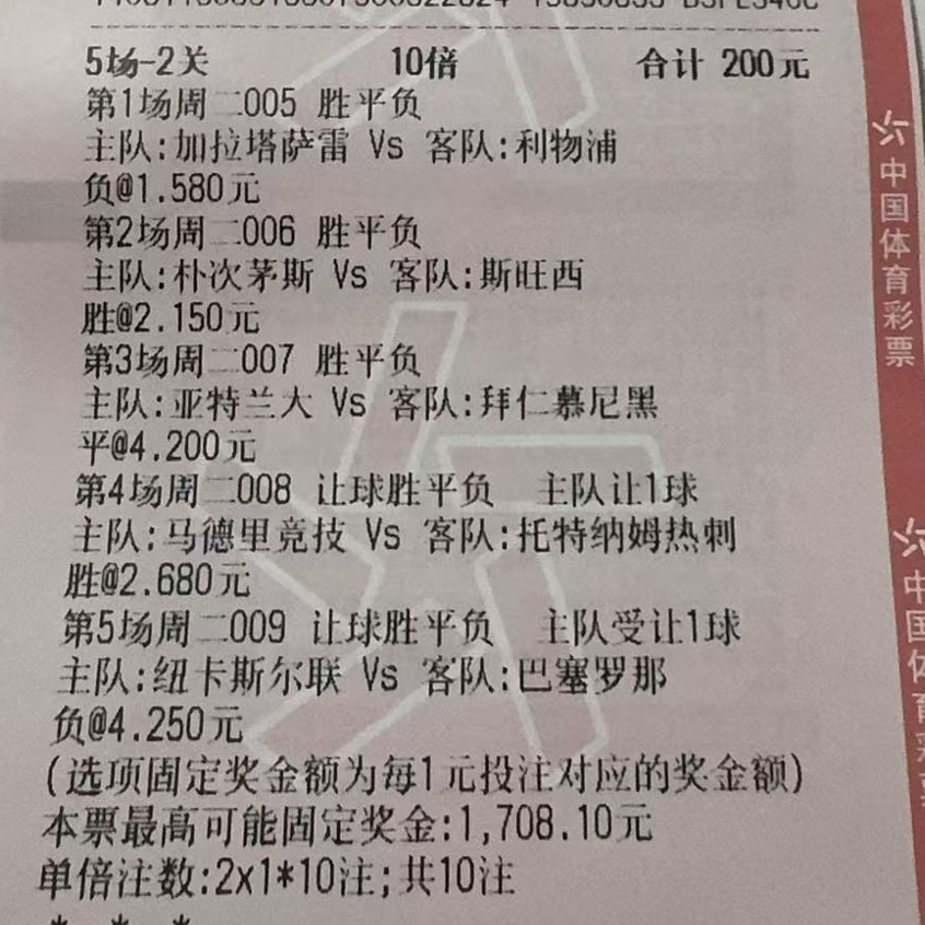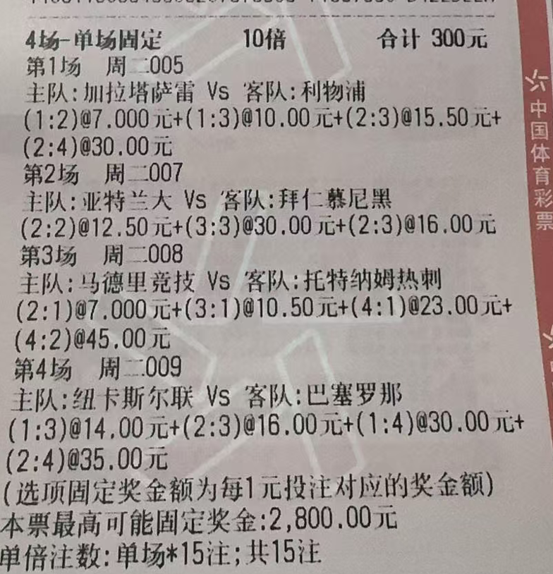 还是竞彩单,还是风险一起扛起来!昨天的竞彩单致歉,完全是出票错误所致,因为一直有两年多时间在这家店里出票,基本上就错过1-2次,所以对出票还是很信任没有检查经彩票就发出来了,有两场比赛敦刻尔克这场的平局被打成西班牙人的让平,最后的比分单大家也看到了,一直就不看好西班牙人取胜,却被出成让平,最后......教训呀,以后还是要注意!