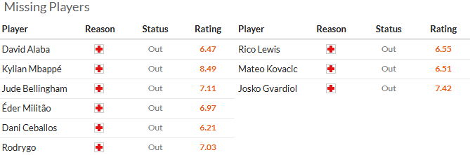 皇马和曼城连续5个赛季在欧冠中遭遇,双方都有些审美疲劳。皇马近期在联赛中非常挣扎,上轮做客2比1险胜塞尔塔,巴尔韦德最后时刻的远射造成折射。人员方面,阿拉巴、姆巴佩、贝林厄姆、米利唐、塞瓦略斯、罗德里戈都因伤缺阵。曼城方面,近期多线作战,球队也很疲惫。人员方面,里科刘易斯、科瓦契奇和格瓦迪奥尔因伤缺阵。罗德里的复出对球队还是比较重要。综合考虑,本场我看好两队打出大比分的平局。