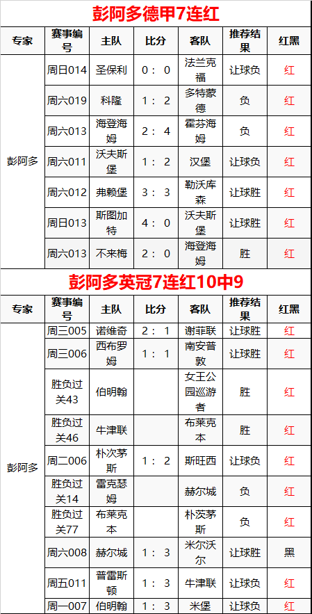 彭阿多德甲7连红 英冠7连红10中9