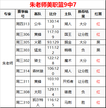 朱老师昨美职篮单场命中 长线近9中7