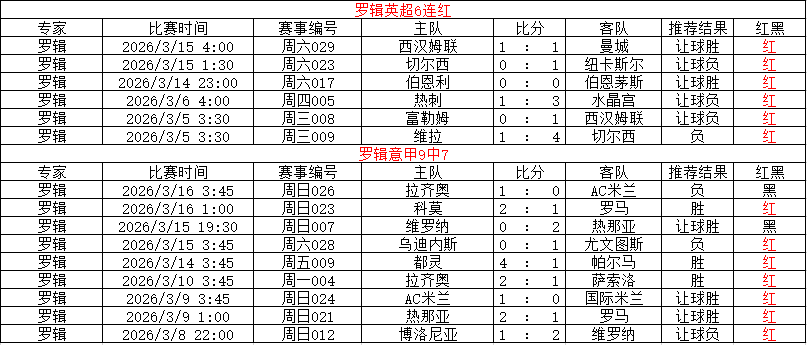 罗辑 英超6连红 意甲9中7