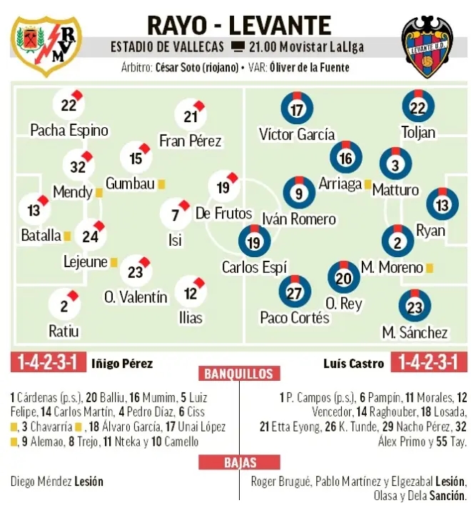 巴列卡诺上轮做客1比1打平塞维利亚,暂时领先降级区5分,还是有比较大的保级压力。周中的欧协联淘汰赛,他们做客3比1击败土超球队萨姆松体育,回到主场晋级问题不大,这场比赛肯定全力以赴。球队的阵容比较齐整,迭戈-门德斯因伤缺阵。做客的莱万特排在倒数第2位,本场多人伤停,阵容严重不整。正路!