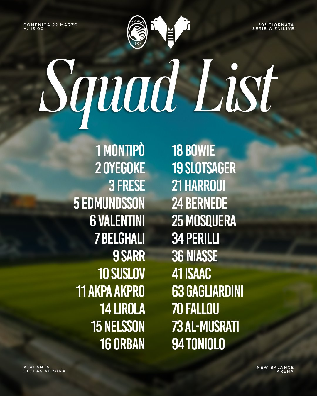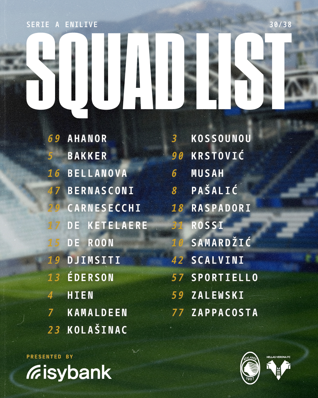 维罗纳刚在博洛尼亚身上反弹,上轮就又输给热那亚,维持在垫底位置,落后安全区9分,只剩理论保级希望。51个失球,防守意甲最差,关键进攻也不行,只比莱切多进1个,攻防数据明显缺乏支撑,临时主帅萨内蒂也没有太好解决问题办法。本赛季维罗纳只赢了3场,其中一场就是拜亚特兰大,这也是他们为数不多的底气所在。塞尔达、科特查普、洛夫里奇、布拉达里奇继续缺席,中场伯内德伤愈回归,进入名单,阵容较上轮没有太大变化。