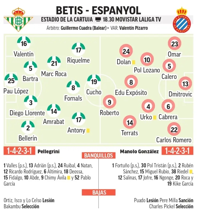 皇家贝蒂斯上轮做客1比2不敌毕尔巴鄂竞技,近7场比赛只有1胜,暂时排名第5,落后第4的马竞13分之多,领先第6的塞尔塔3分。按照目前的欧战形势,表现不错的西甲下赛季很可能会继续拥有5个欧冠名额,那贝蒂斯能否守住第5名就显得至关重要。刚刚帮助刚果拿到世界杯参赛资格的巴坎布本场缺席,两位名将洛塞尔索、伊斯科以及奥尔蒂斯都因伤缺阵。