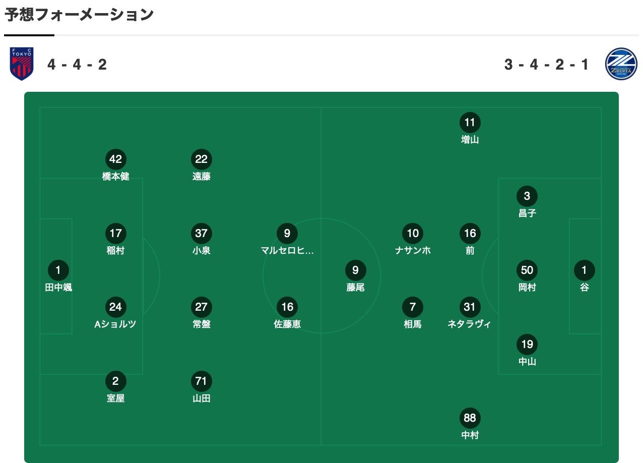 两队在本周中刚刚进行了一场交锋,这是因为町田泽维亚即将参加亚冠淘汰赛而提前进行,FC东京在客场3-0击败町田泽维亚,佐藤恵允梅开二度并且还有一个助攻表现出色,这场胜利也让FC东京在积分榜上反超了町田泽维亚排名东部第2位,而本轮排名榜首的鹿岛鹿角只收获平局,本场如果获胜可以将几分差距缩小到1分,球队的战意还是较足,阵容上主力中场橋本拳人停赛无法出战,后卫長友佑都、森重真人、主力前锋長倉幹樹、替补小柏剛都因伤缺席,中场中场俵積田晃太、荒井悠汰出战有一定疑问,门将金承奎、中场佐藤龍之介都结束了国家队比赛任务回归。