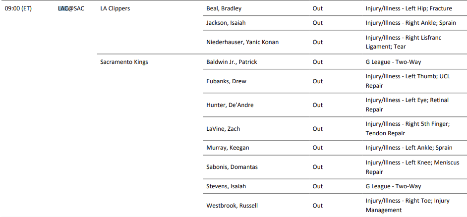 这场比赛咱们还是先来看两支球队的人员情况,快船队这边尼德豪泽依旧是打不了,毕竟已经赛季报销了,而像以赛亚杰克逊也是无法登场。但是国王队这边伤病报告就非常多了,大家可以直接看图。