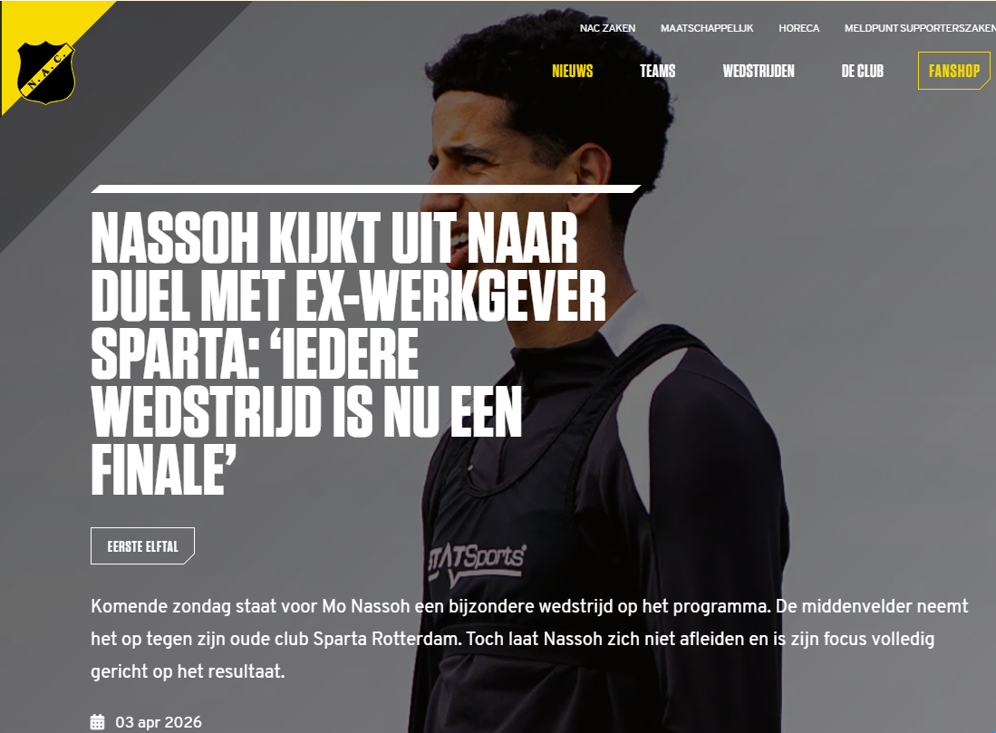 布雷达本赛季阵容不太行,比如队内的摩洛哥中场纳索(上图)24次出场射入4球、还有1次助攻,竟然是头号射手。赛前,他也接受了专访,谈到了与前东家斯巴达(去夏才从鹿特丹斯巴达转来)的对决:“现在每场比赛都是决赛。是的,确实有点紧张,”他承认道。“但我认为我们目前还不需要与对手过多纠缠。我们必须从自身出发思考,从中汲取动力。”尽管与老东家重逢,纳索并未感到额外压力。“不,其实没有。无论对手是谁,你总想展现最好的自己。”