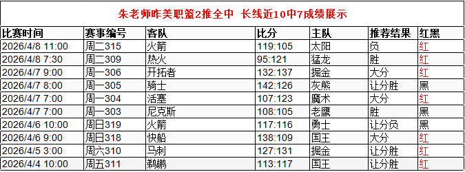 朱老师昨美职篮2推全中 长线近10中7