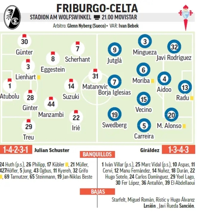 弗莱堡上轮联赛在主场两球领先的情况下2比3输给拜仁,比朔夫的梅开二度让弗赖堡意想不到,最后时刻被绝杀。本场弗赖堡阵容齐整,但上轮联赛他们消耗很大,同时联赛排名并不稳固,处于欧战区边缘。相比之下,塞尔塔暂列西甲第6位,甚至还有机会冲击第5名,按照目前的欧战积分,西甲下赛季可能有5个欧冠名额。人员方面,斯塔菲尔特、拉蒙、里斯蒂奇、H.阿尔瓦雷斯因伤缺阵,鲁埃达停赛。综合考虑,让负!