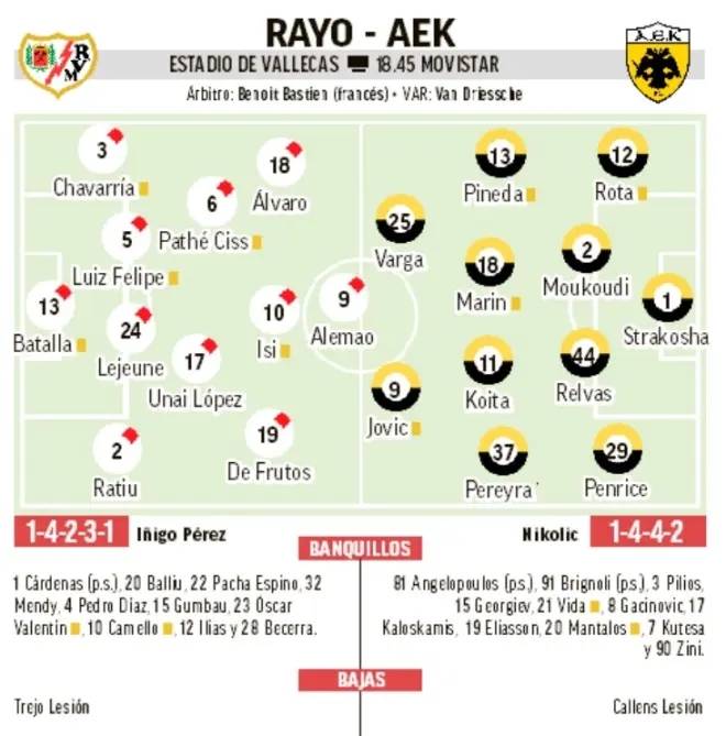 巴列卡诺上轮在主场1比0小胜埃尔切,近4场只有1胜。上个欧协联主场,他们在主场0比1输给土超球队萨姆松体育,好在球队在客场3比0完胜对手,以总比分3比1晋级。特雷霍是全队唯一的伤员。雅典AEK目前排在希腊超首位,球队的战力不容低估,阵容也很齐整,仅有卡伦斯因伤缺阵。综合考虑,本场我力挺主胜。