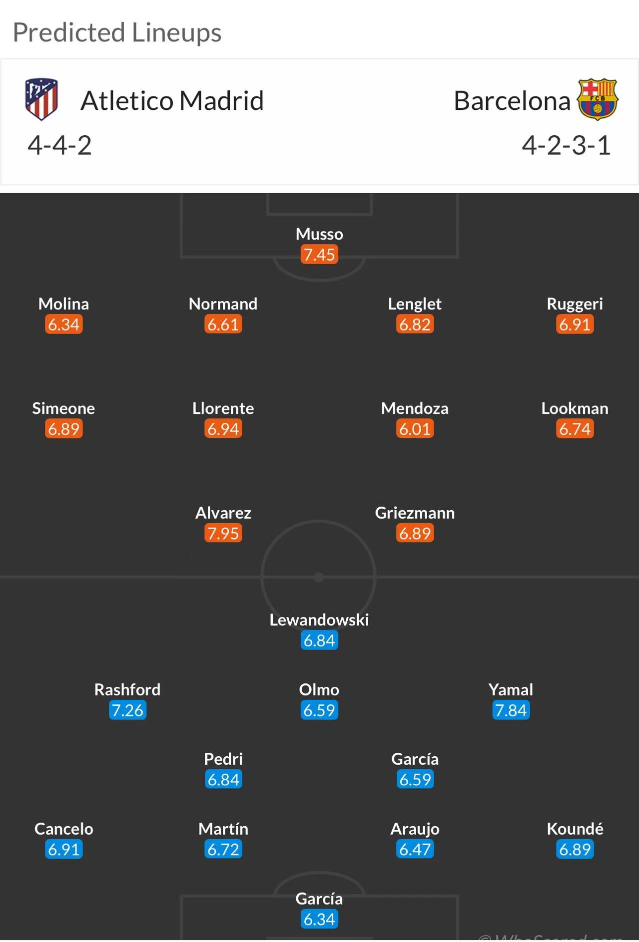 首回合马竞在客场多打一人的情况下2比0赢球,阿根廷前锋阿尔瓦雷斯打进精彩的任意球。本场后卫普比尔停赛,门将奥布拉克等人因伤缺阵。巴萨则缺少巴西边锋拉菲尼亚,上一场被罚下的年轻后卫库巴西停赛。我更看好客胜方向。