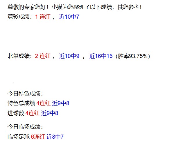 2、北单昨天5红4,整体是达成了16红15,今天看好的胆已经发专栏,我们一起继续开心。另外我的专栏中还会有超信心且不中返的“百搭场次”、早晨各个美洲赛事的“每日最终单”等红色系列选择,只要达标的比赛出现,我就会来给到您。
