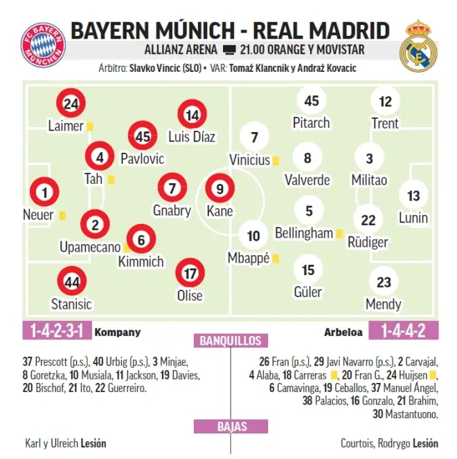 拜仁首回合做客2比1击败皇马,哈里-凯恩取得进球。上轮联赛,哈里-凯恩完全得到轮休,拜仁还是大胜对手,拿到本赛季的德甲冠军只是时间问题。人员方面,新星伦纳特-卡尔和替补门将乌尔赖希因伤缺阵。皇马上轮联赛在主场1比1打平赫罗纳,联赛争冠无望,主力门将库尔图瓦和巴西边锋罗德里戈因伤缺阵。拜仁和皇马近年来交手多以皇马获胜告终,这一次拜仁有双杀的机会,我认为他们不会给对手留面子,继续干!