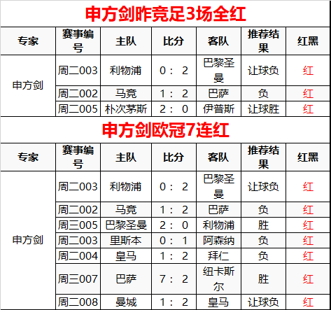 申方剑昨竞足3场全红 欧冠实时7连红 今日两场全力出击