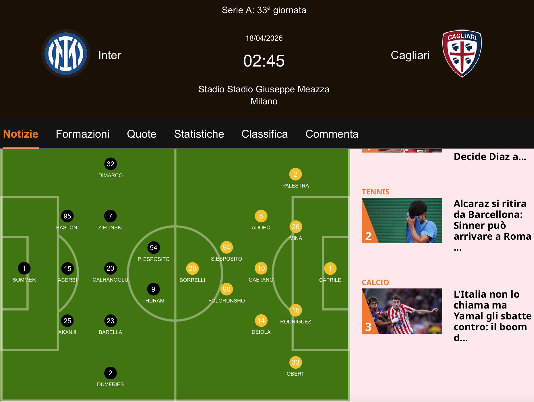 国际米兰上轮客场4-3击败科莫,比赛中在两球落后的情况下逆转,小图拉姆和邓弗里斯都是梅开二度,目前24胜3平5负在积分榜排名榜首,领先身后的那不勒斯9分夺冠形势不错,而且最近的几轮对手也都不算太强,球队下周还有与科莫的意大利杯半决赛第二回合比赛,首回合客场0-0战平还是有晋级悬念,本赛季为了双冠王努力,本场中场苏契奇停赛无法出战,后卫比塞克、主力前锋劳塔罗·马丁内斯都是因伤缺席。