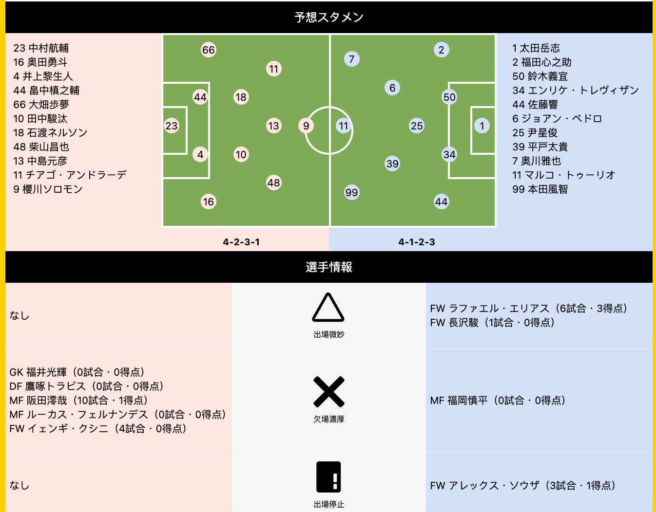 大阪樱花上轮发挥不错,在德比中击败了大阪钢巴,结束了3轮不败的局面,这个赛季,因为阵容一般,加上伤停不少的因素,球队之前成绩不好,不过上轮比赛还是体现出该队的能力不错。从阵容出发,中场阪田澪哉等几名球员继续缺席,还是会给出4231的配置,锋线上箭头是櫻川所罗门。