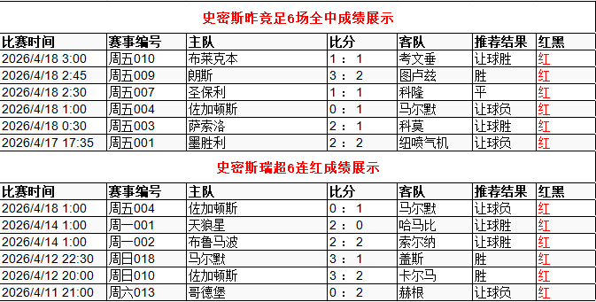 昨竞足6场全中 瑞超6连红 点击→